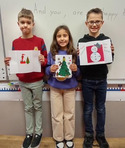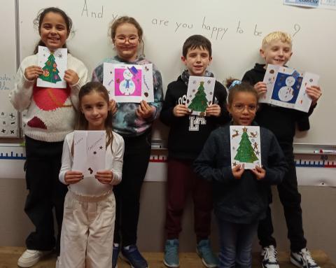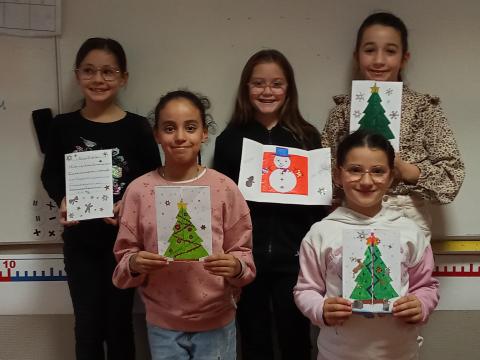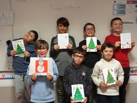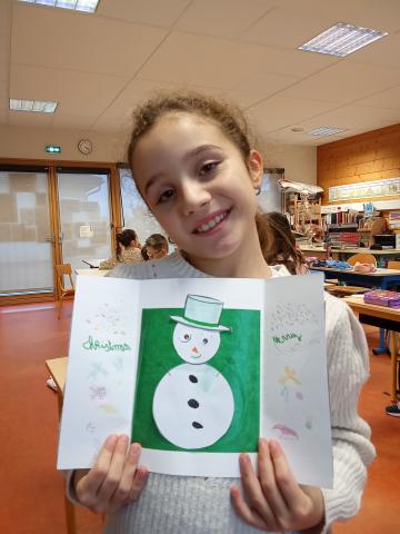 On leur a préparé des Christmas Cards avec notre présentation personnelle "Happy to be me !". Lorsqu'on prépare les cartes avec Grâce , on travaille aussi en anglais.