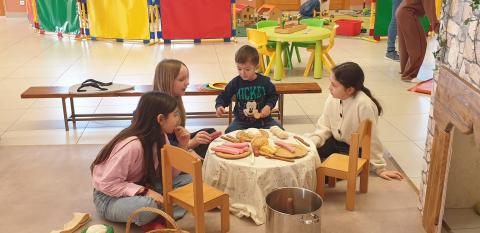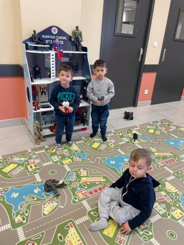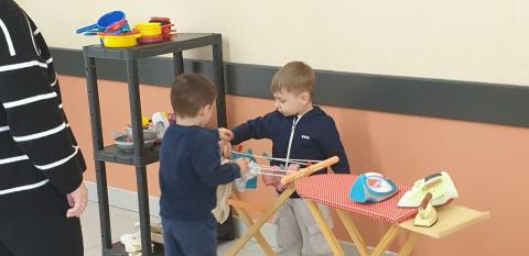 Au premier plan, se trouvaient des jeux collectifs en bois pour les plus grands. Un placard ouvert contenait des jeux de société. Au fond de la salle, il y avait un dortoir pour poupées, une cuisine ,une buanderie et un espace légos.