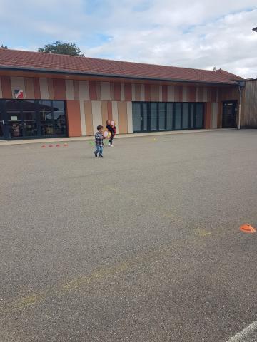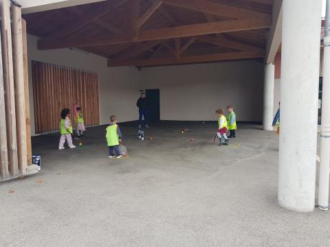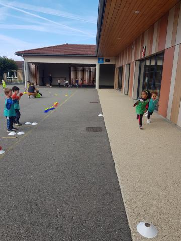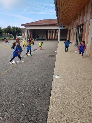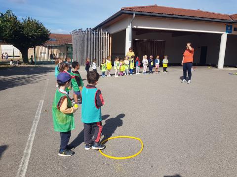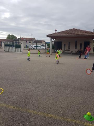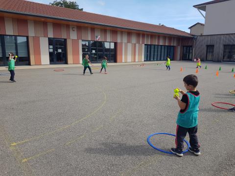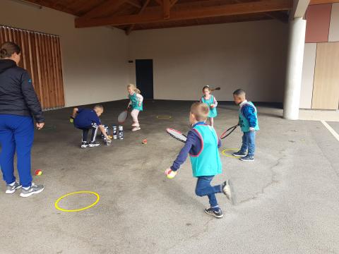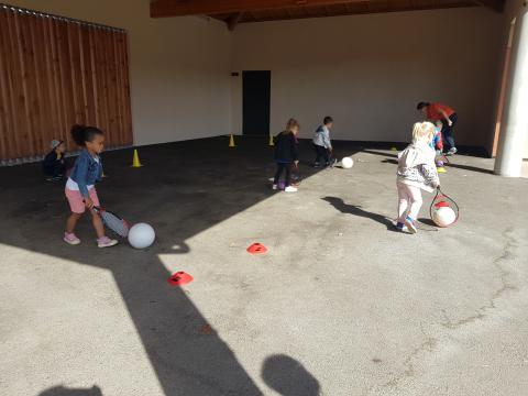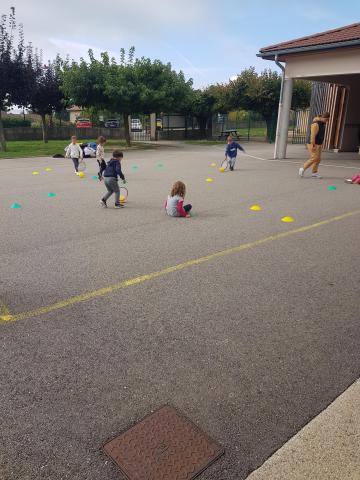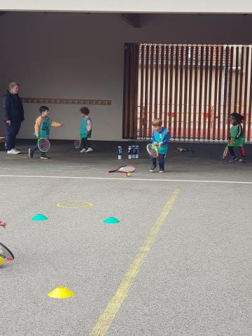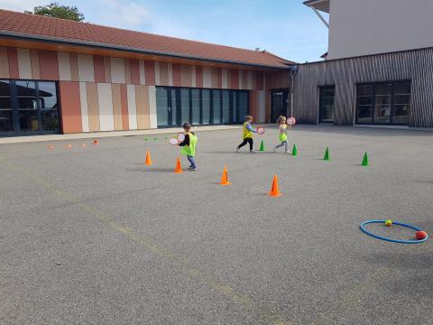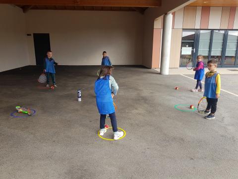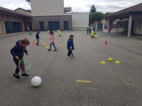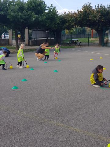 Comme depuis plusieurs années, la classe de MS-GS bénéficie d'un cycle mini-tennis grâce au dispositif "de la cour au court".